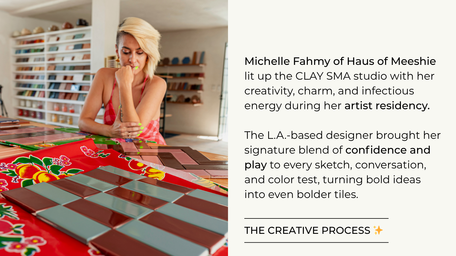 When Clay Imports and Haus of Meeshie crossed creative paths, sparks didn’t just fly. They exploded into a kaleidoscope. The result? A curated tile collection that fuses handcrafted design with Michelle Fahmy’s bold, maximalist aesthetic. Together, we composed a collection that captures the spirit of joy, nostalgia, and unapologetic self-expression. Expect punchy color pairings, with classic and trumpet-shaped tiles that invite you to play, mix, and remix patterns YOUR WAY.